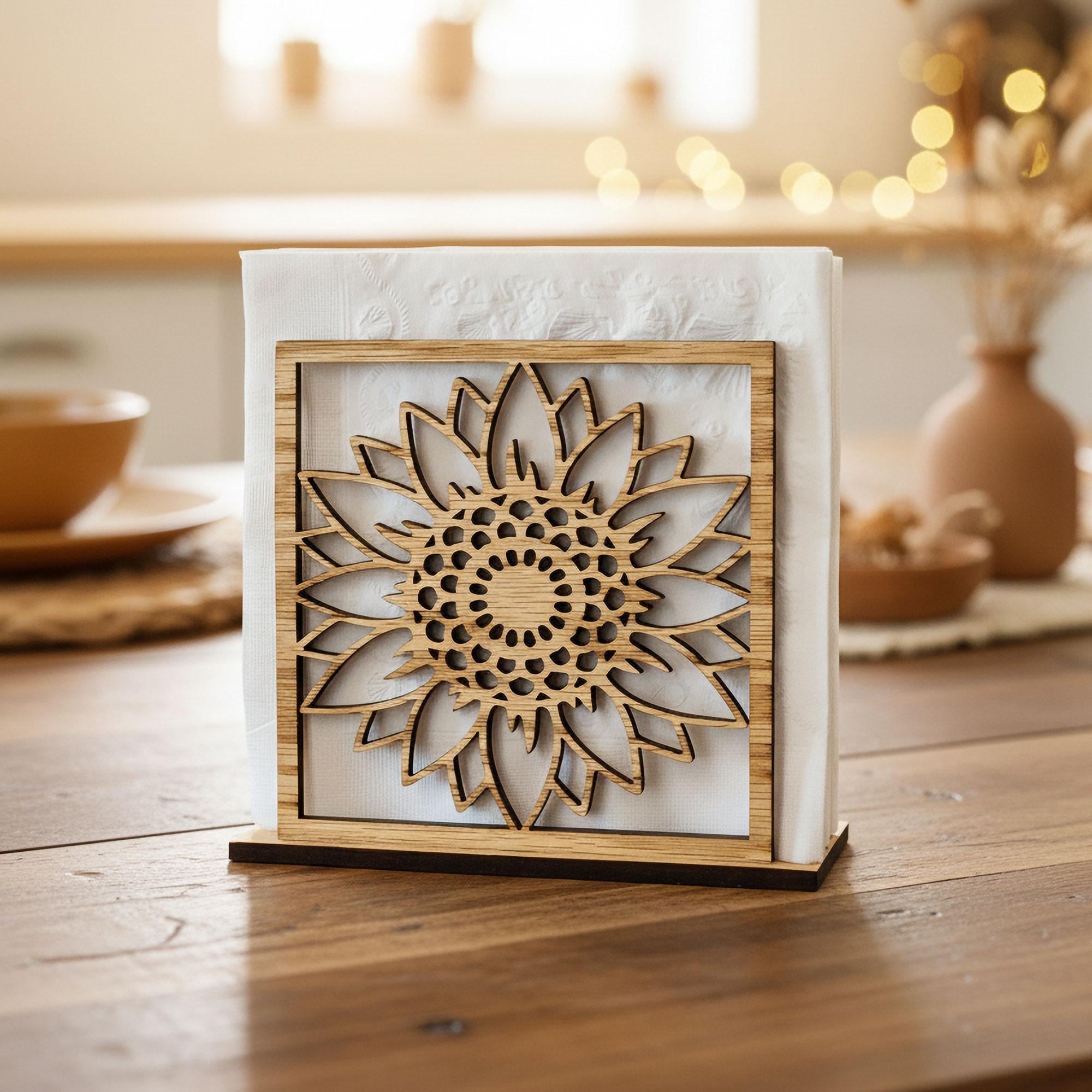 Bring a touch of rustic sunshine to your home with this wood sunflower napkin holder, handcrafted to add warmth and charm to your kitchen or dining table. The engraved sunflower design makes every meal feel a little brighter — perfect for farmhouse, country, or rustic décor styles.