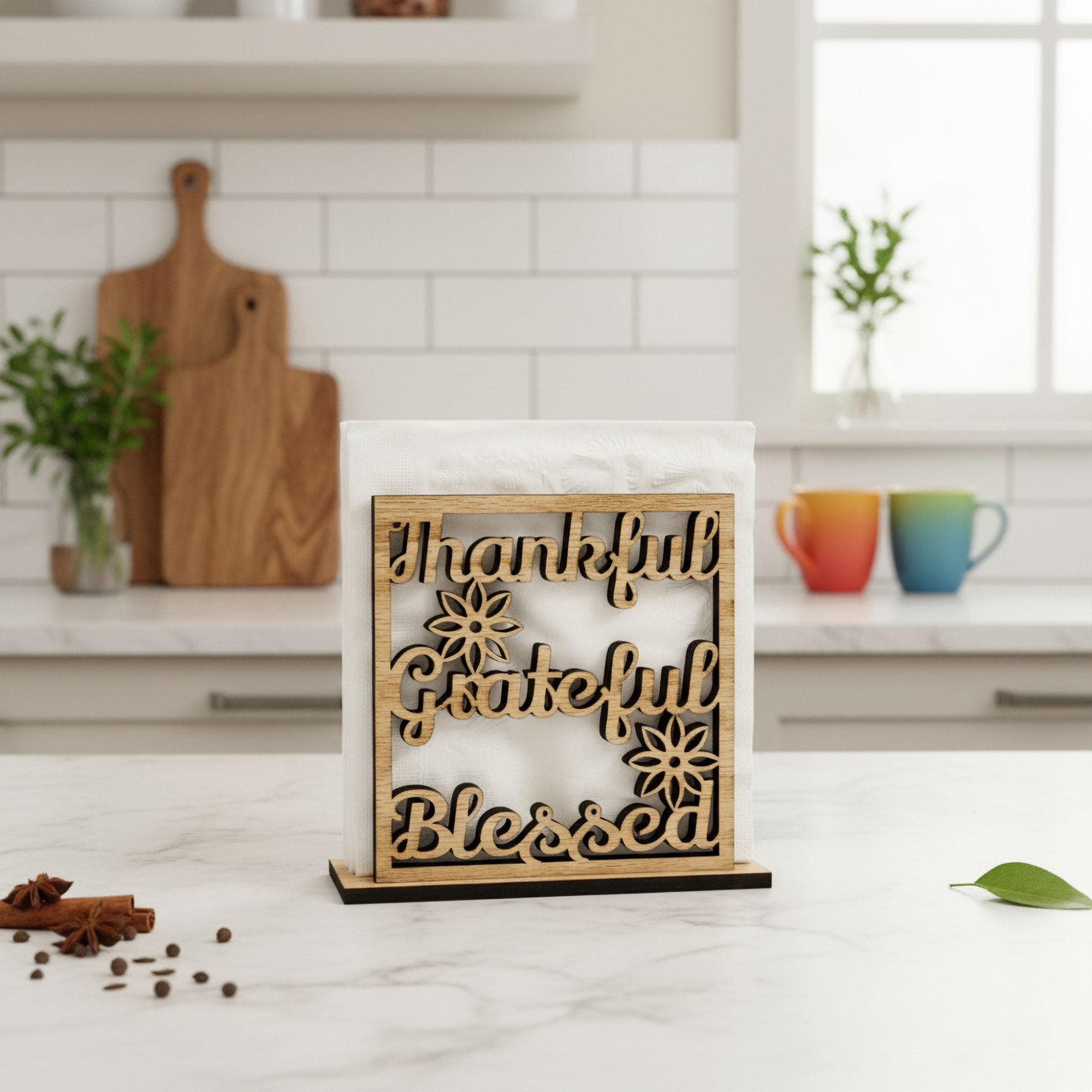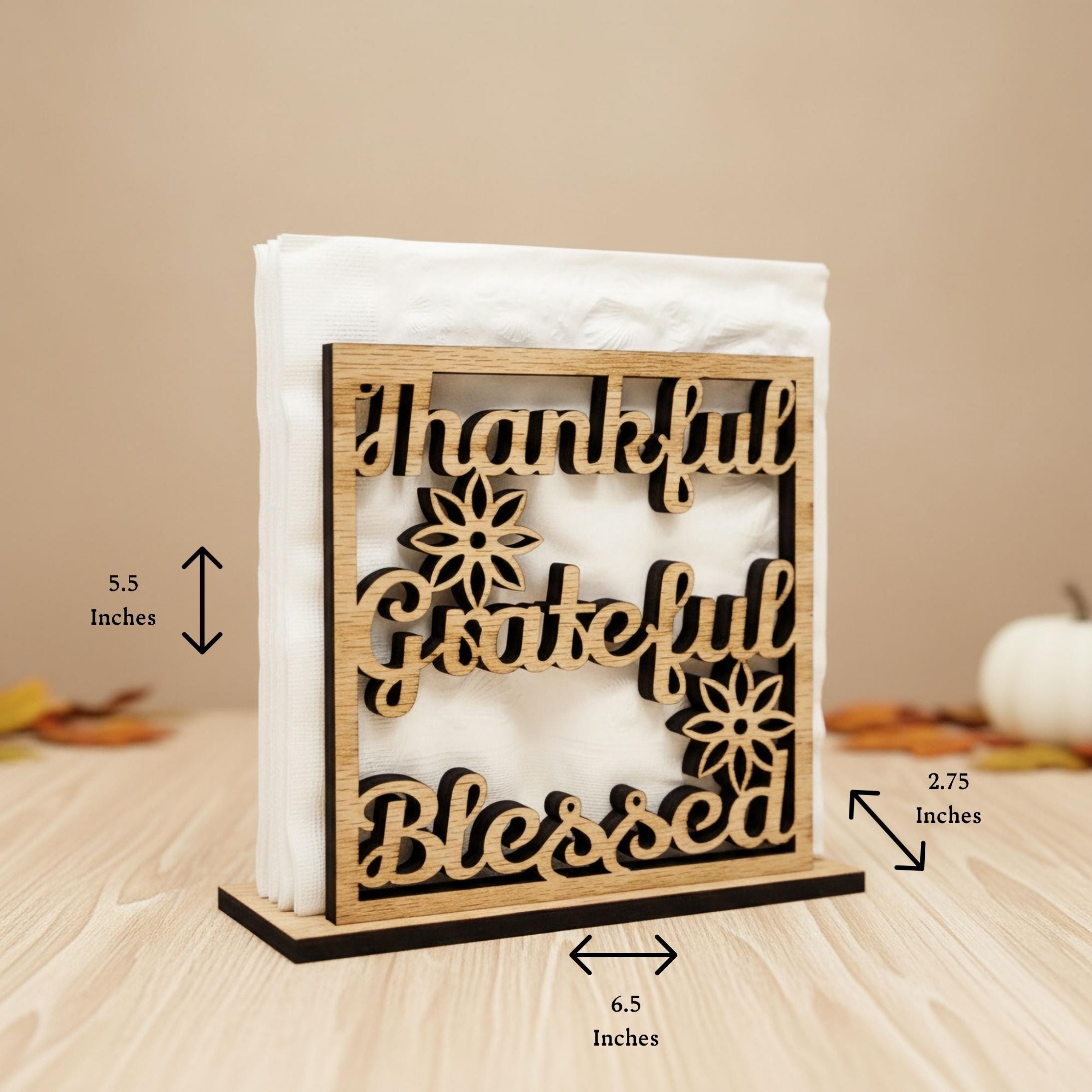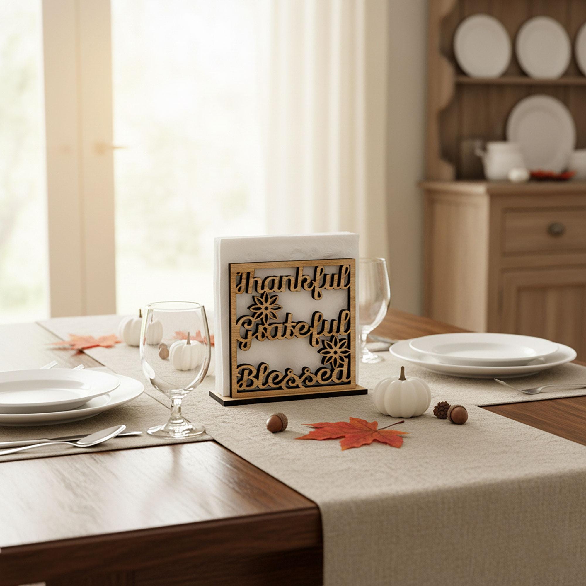 Add warmth and gratitude to your dining space with this Thankful, Grateful, Blessed napkin holder — a heartfelt reminder of what truly matters. Beautifully crafted from wood and designed to keep napkins neatly upright, it brings both charm and function to your table. Perfect for everyday meals and family gatherings.