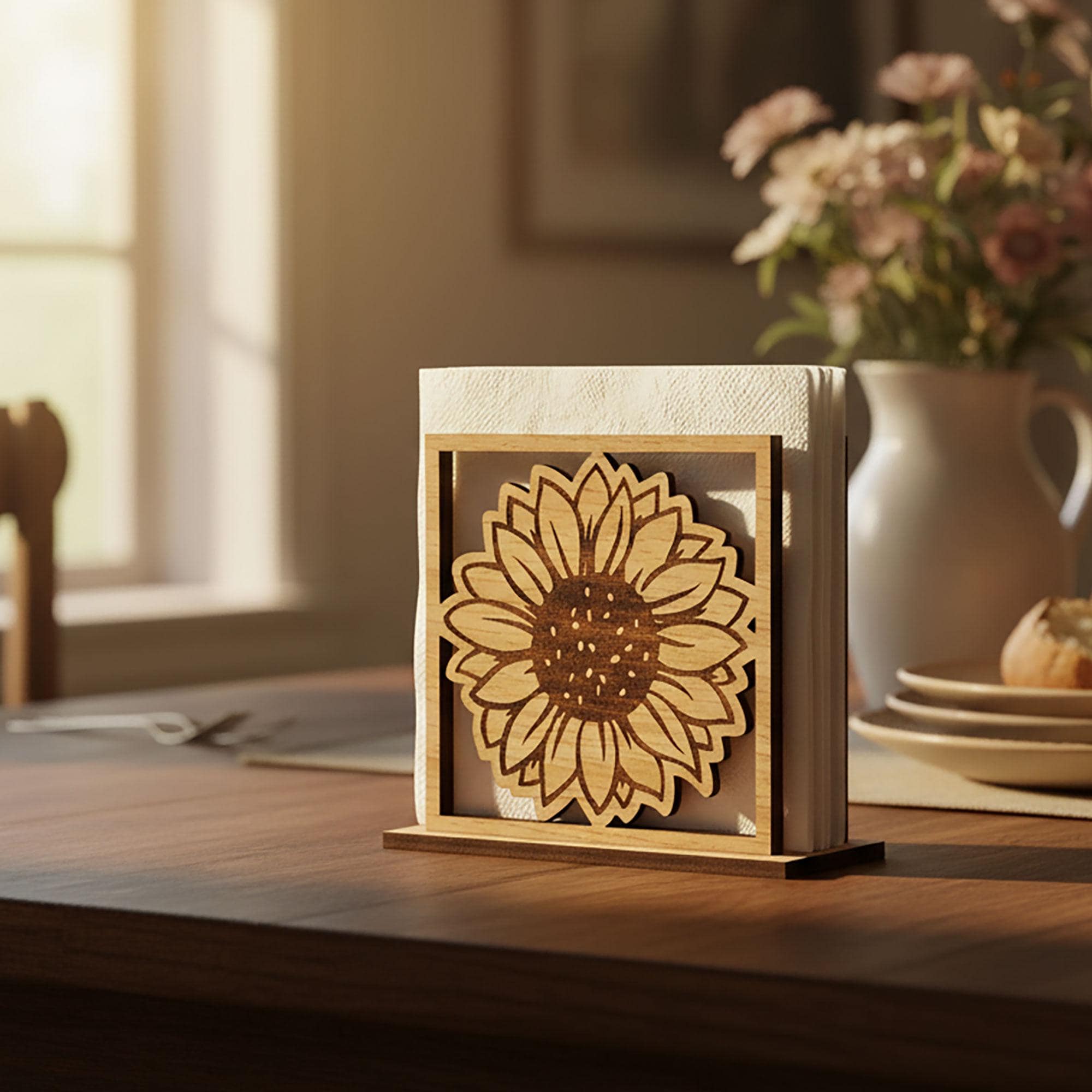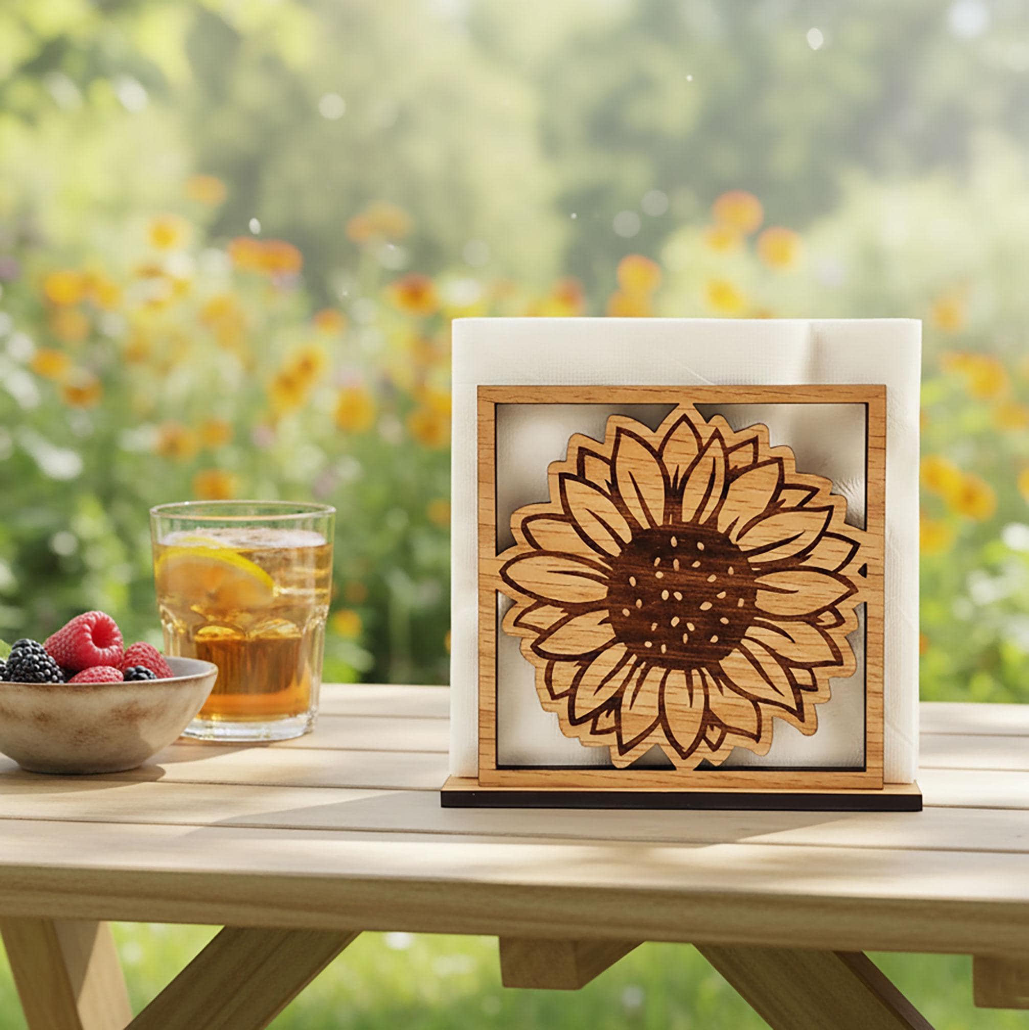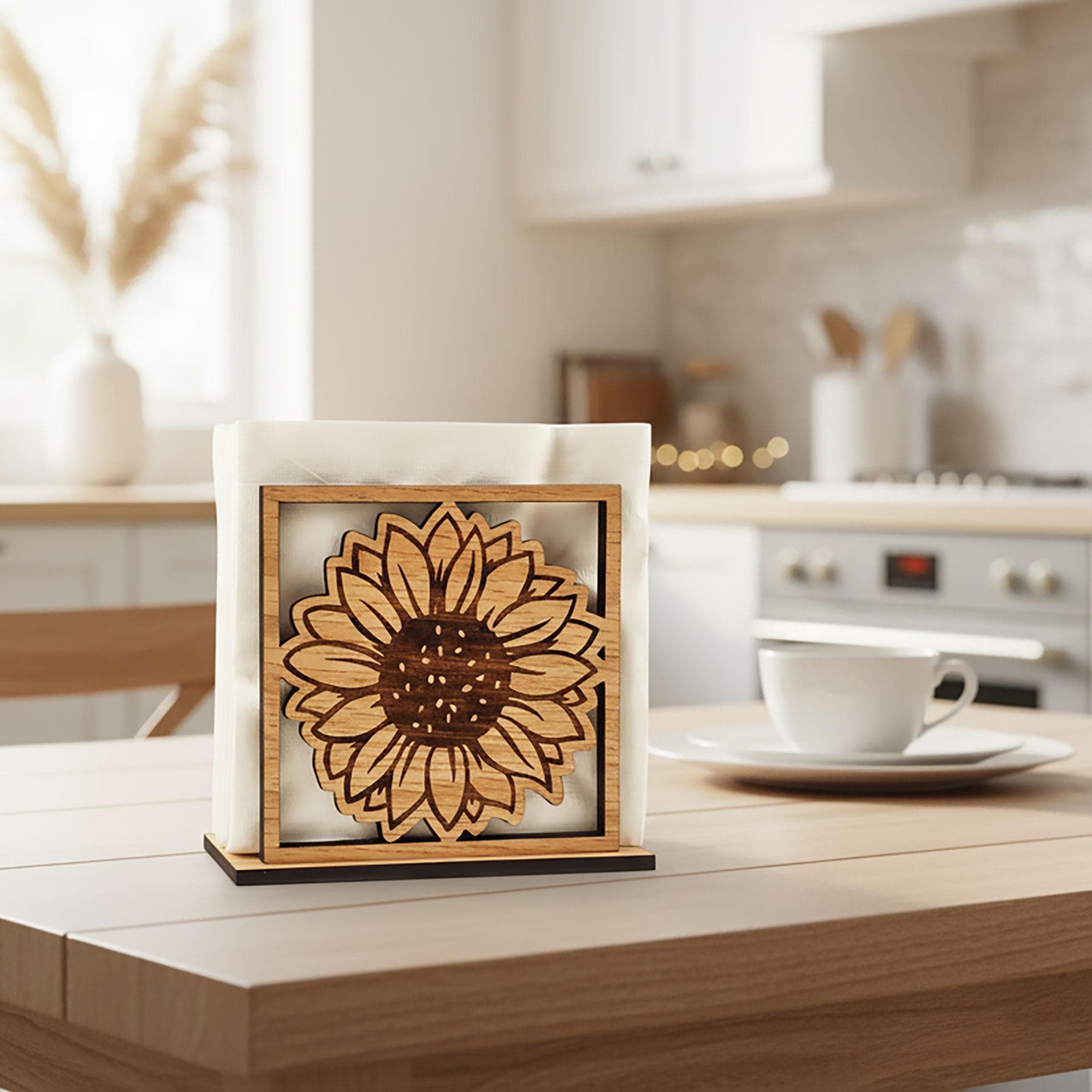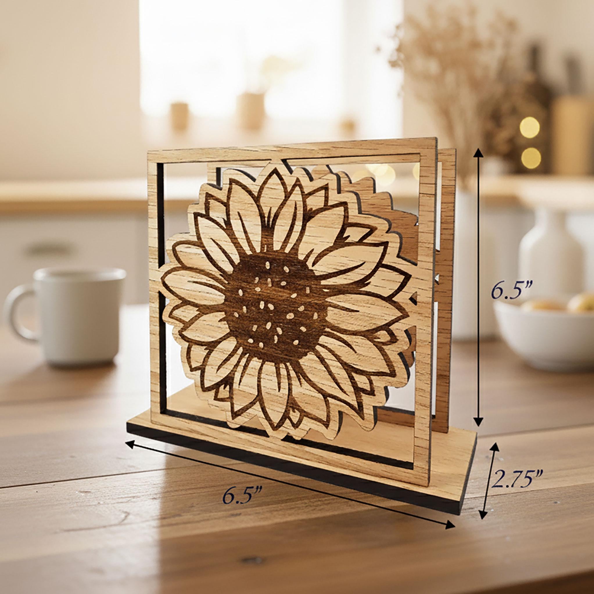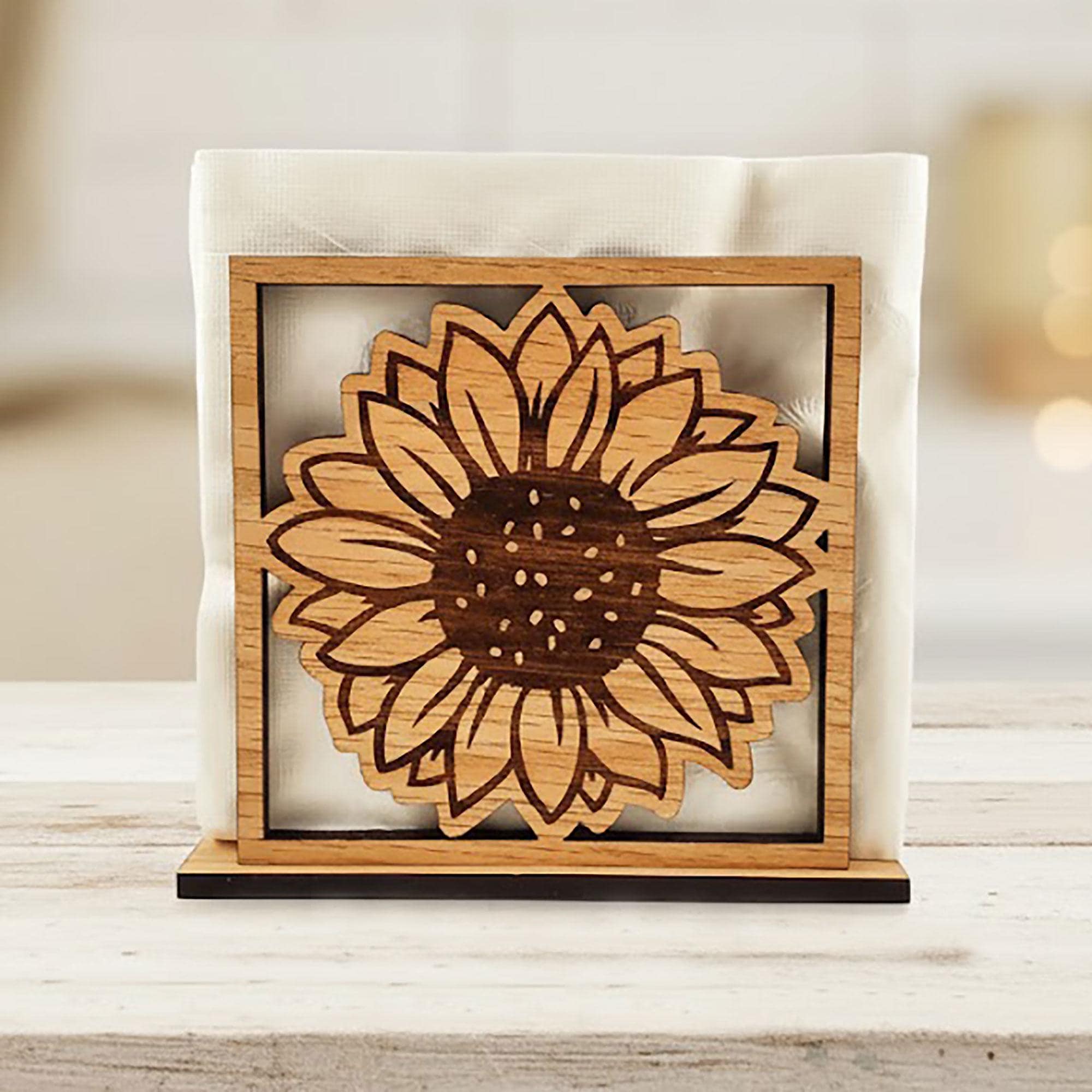 Add warmth and beauty to your dining table with this engraved wood sunflower napkin holder, a perfect piece of rustic kitchen décor for your home. Whether displayed on your kitchen counter or dining table, this farmhouse-style napkin holder brings a cheerful touch of natural charm to any space.