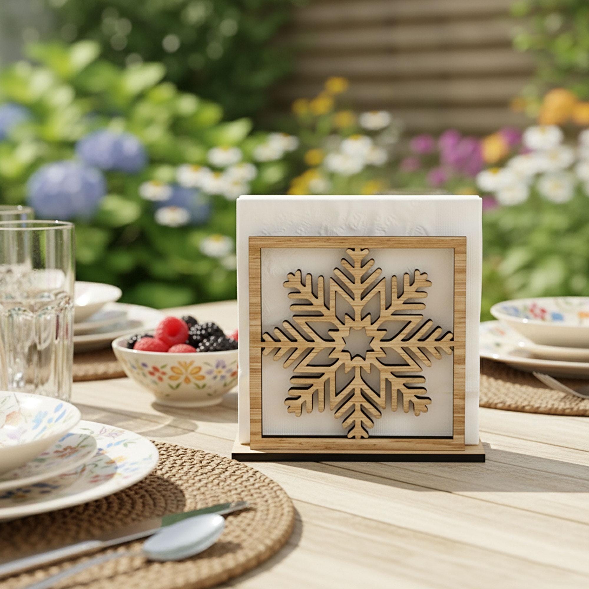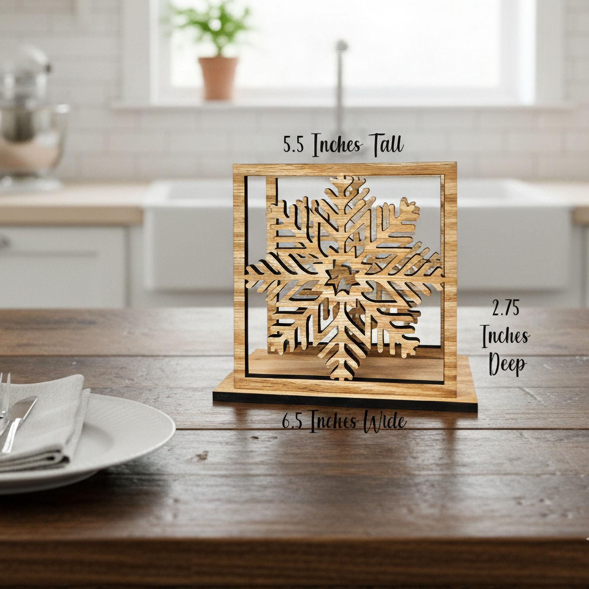 Bring the cozy charm of winter indoors with this Snowflake Napkin Holder, a beautiful piece of rustic wood winter table decor that adds warmth and elegance to your kitchen or dining room.