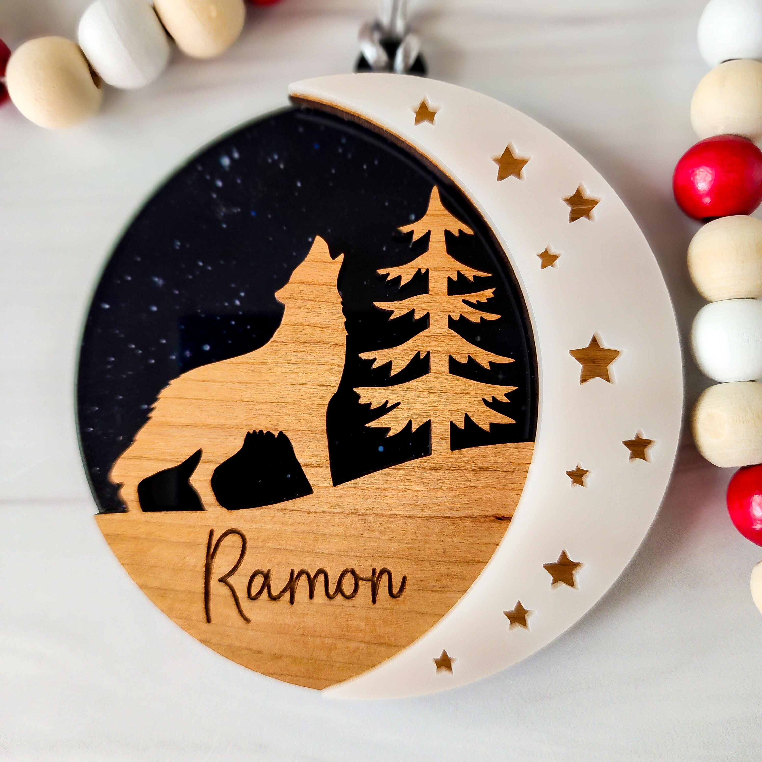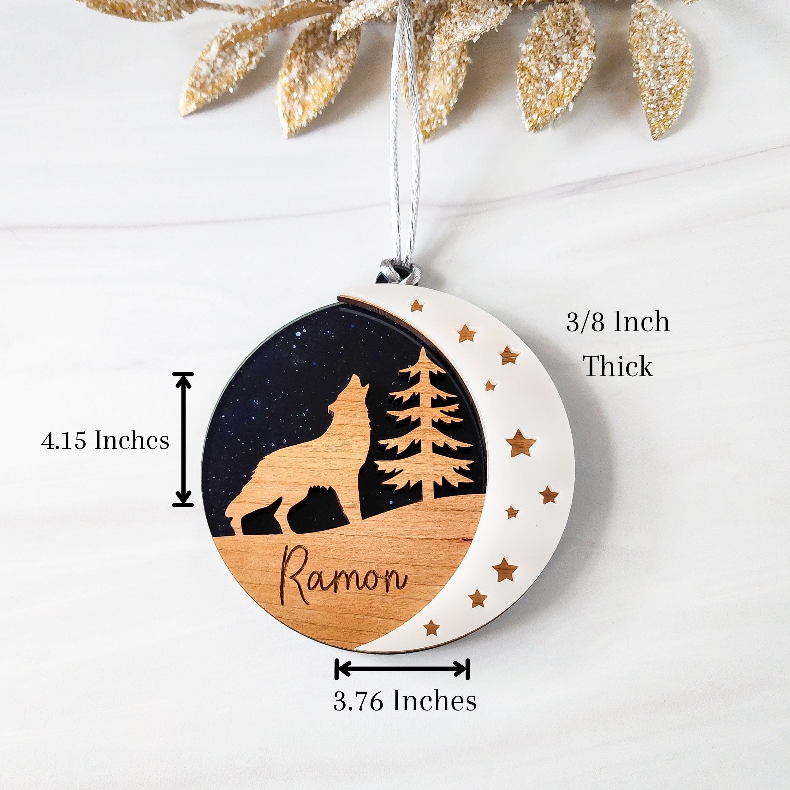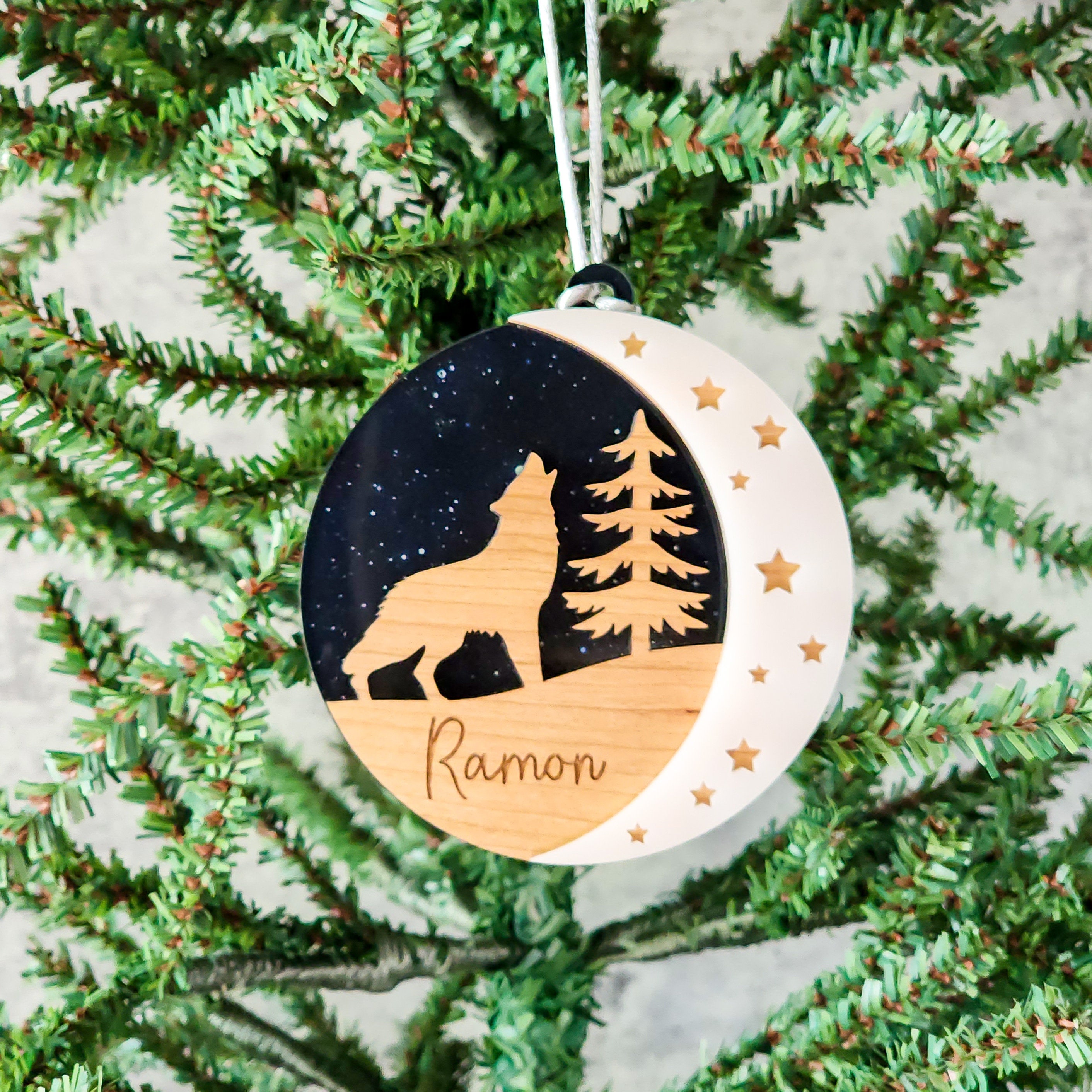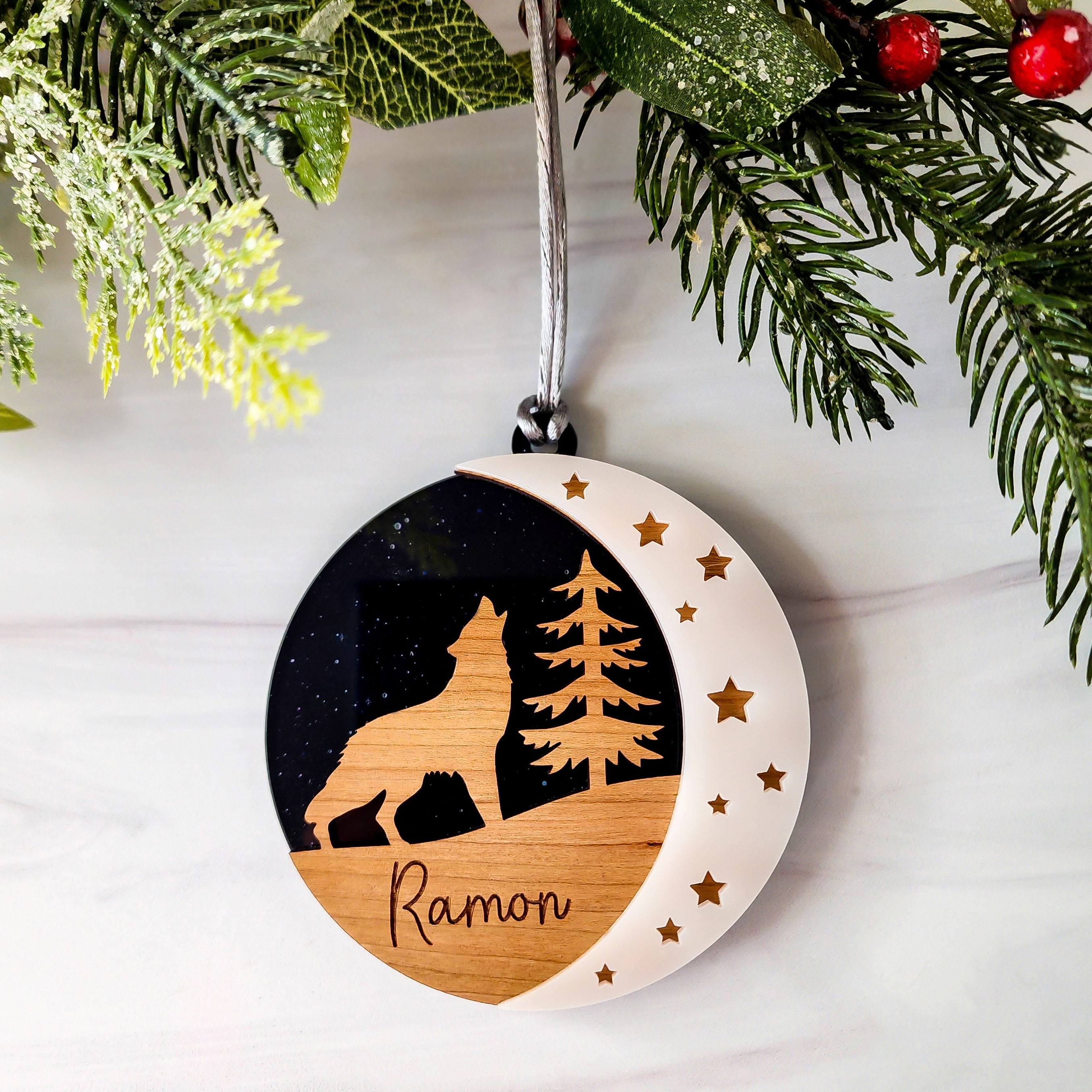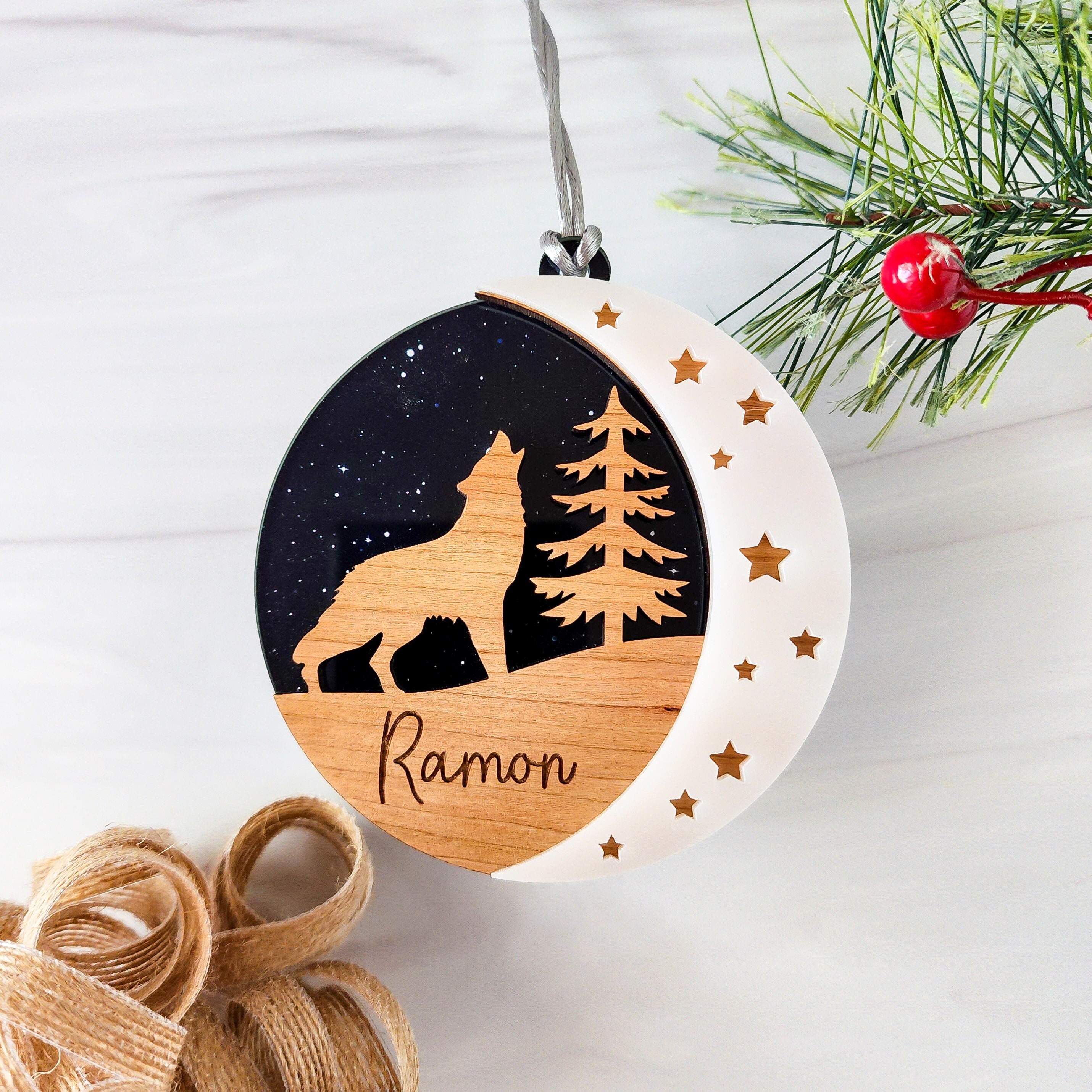 Celebrate the holiday season with this Personalized Wolf Christmas Ornament, a custom heirloom ornament that adds a touch of wild beauty to your Christmas tree. This exquisite ornament is perfect for wolf lovers and makes an ideal Xmas Wolf Lover Gift. Meticulously crafted to capture the majestic spirit of wolves, it serves as a unique piece of Holiday Christmas Tree Home Decor. Whether you're decorating your own tree or gifting to a loved one, this ornament is a wonderful addition to your festive celebrations.