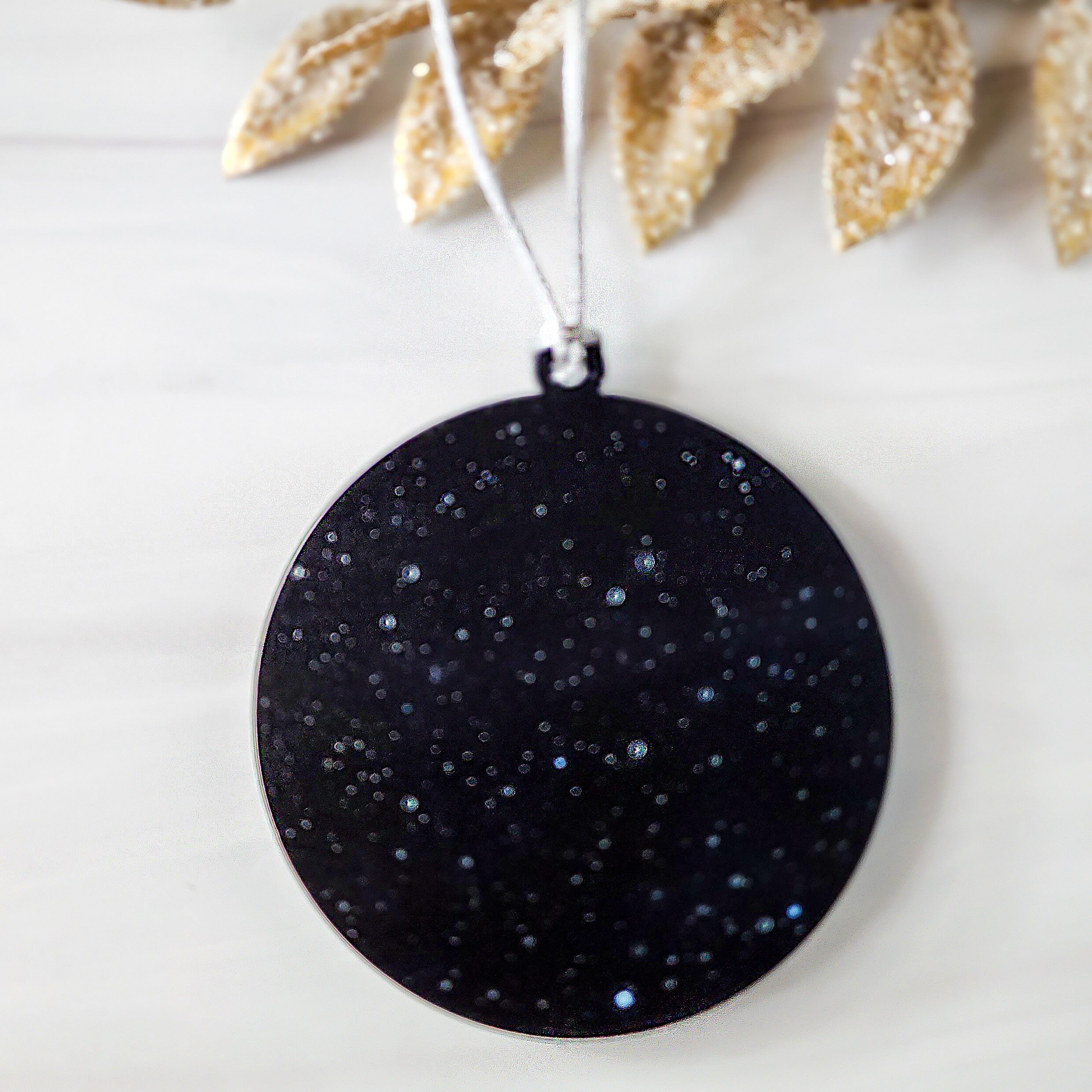 This unique Christmas ornament combines the enchanting elements of a starry night sky, the warmth of cherry wood, and the ethereal glow of a white acrylic moon. The result is a stunning ornament that encapsulates the magic of the holiday season. Don't wait, add this wonderful ornament to your Christmas decor collection today!