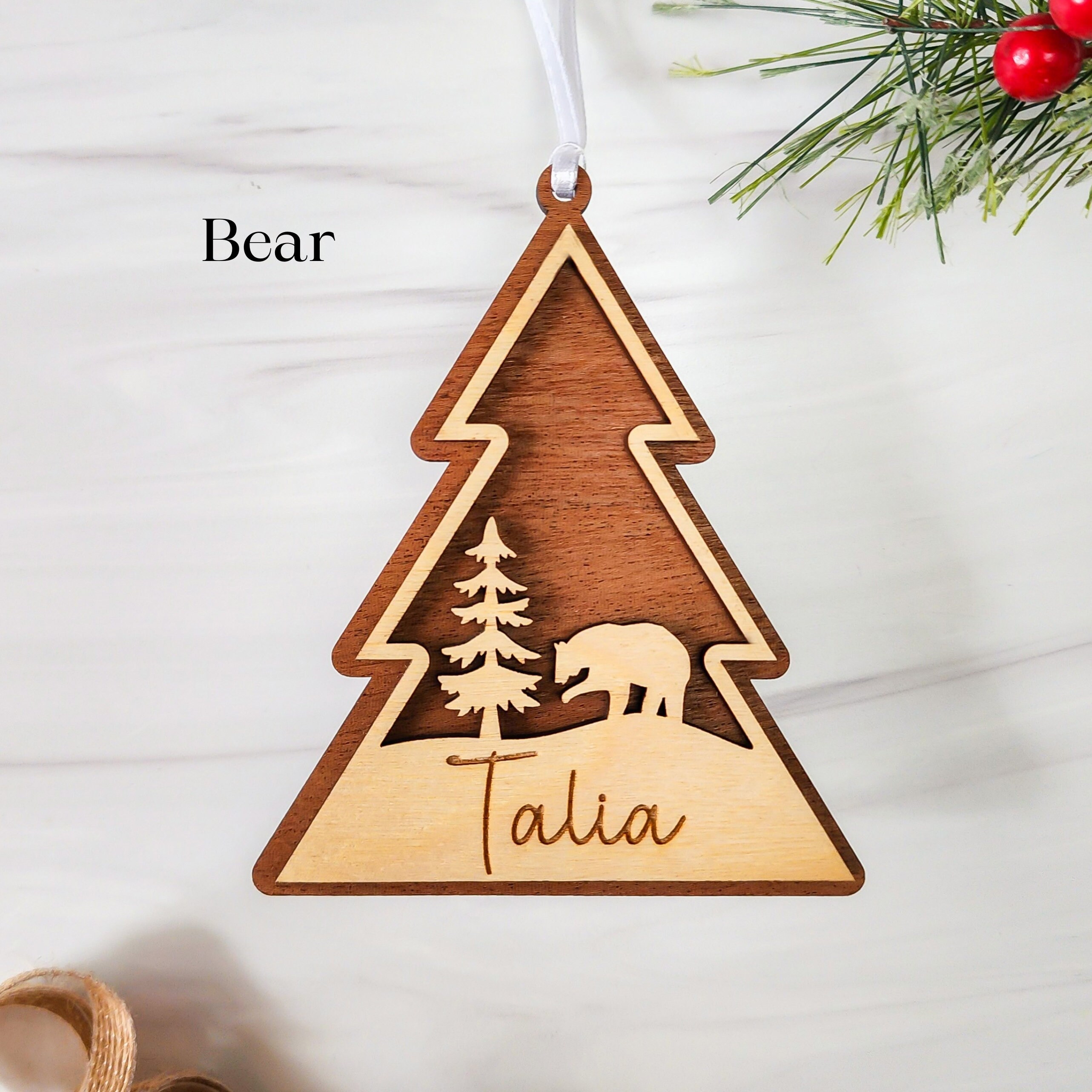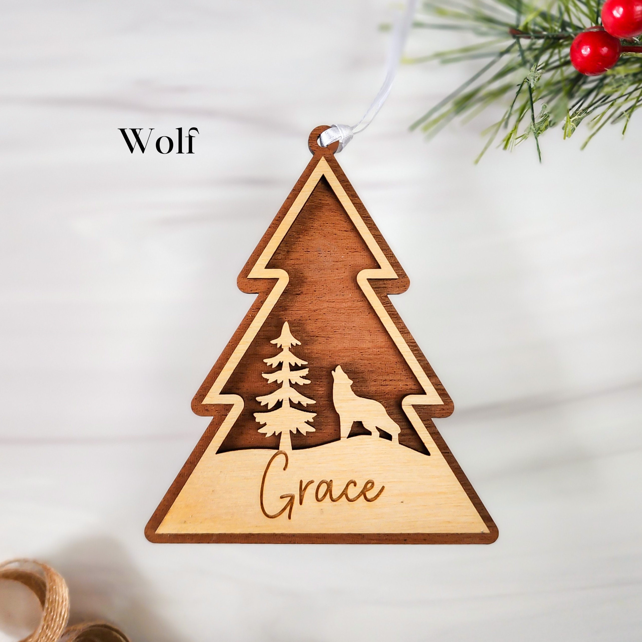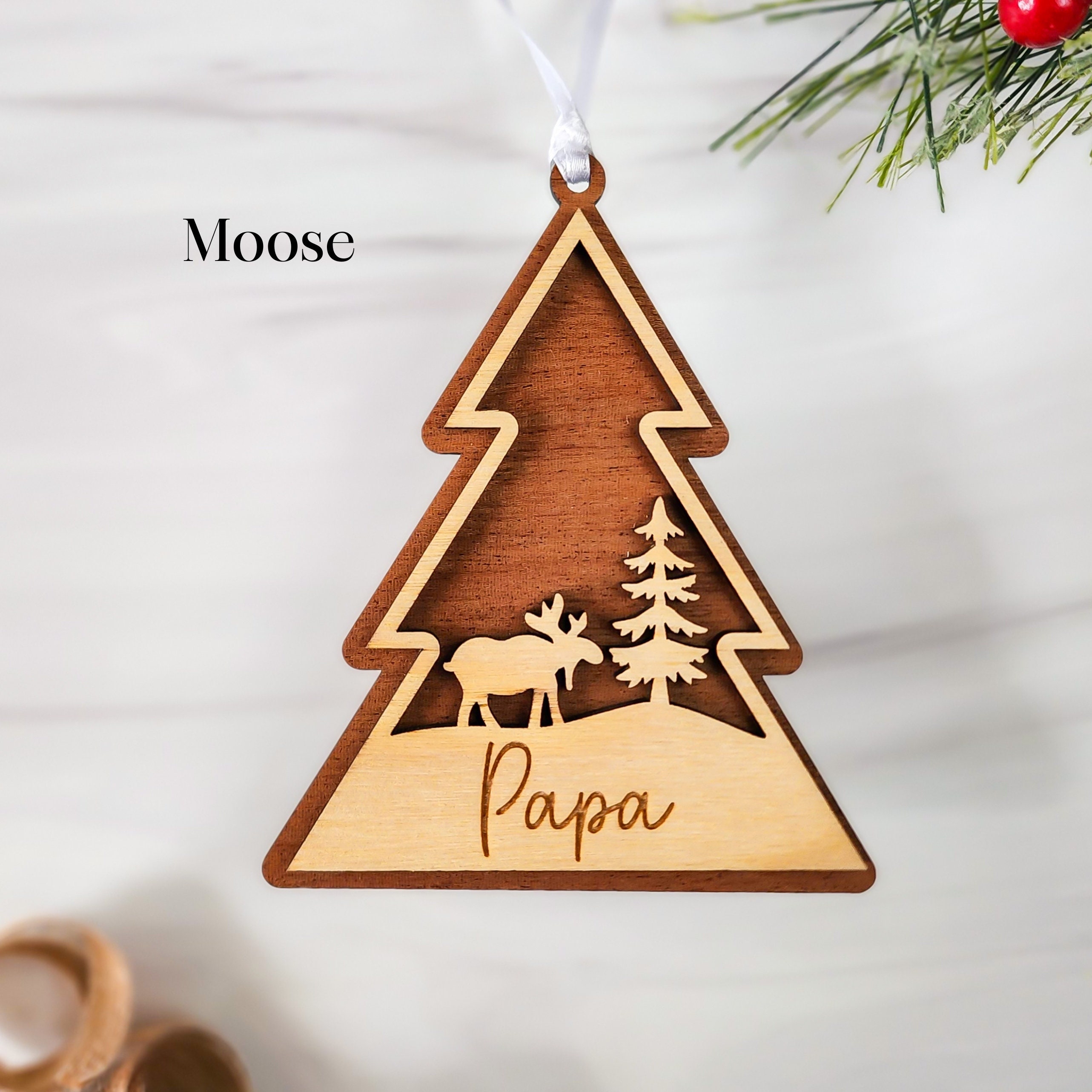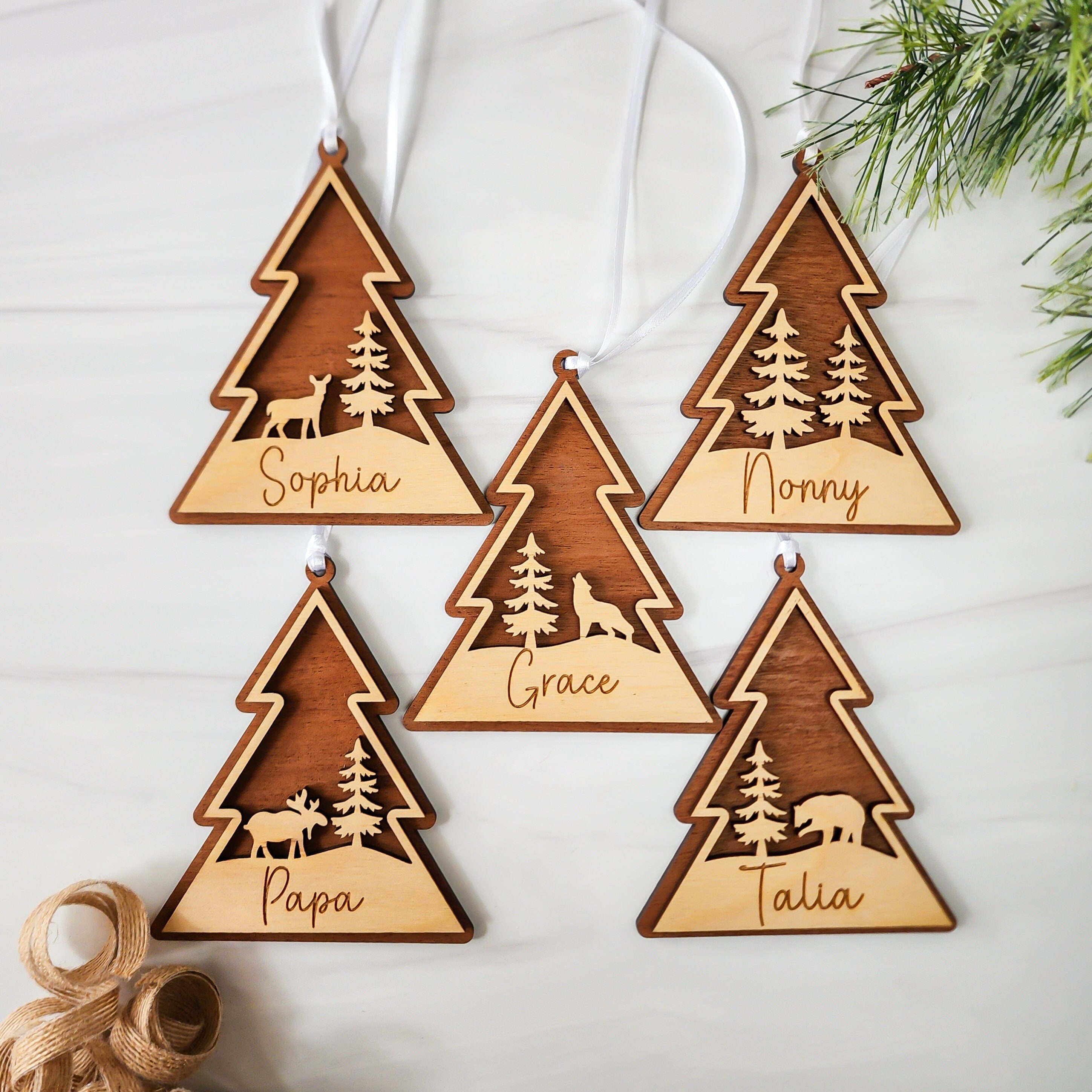 - Personalized Woodland Ornament - Choose Your Design - Moose, Deer, Bear, Wolf, Trees - Holiday Home Decor -