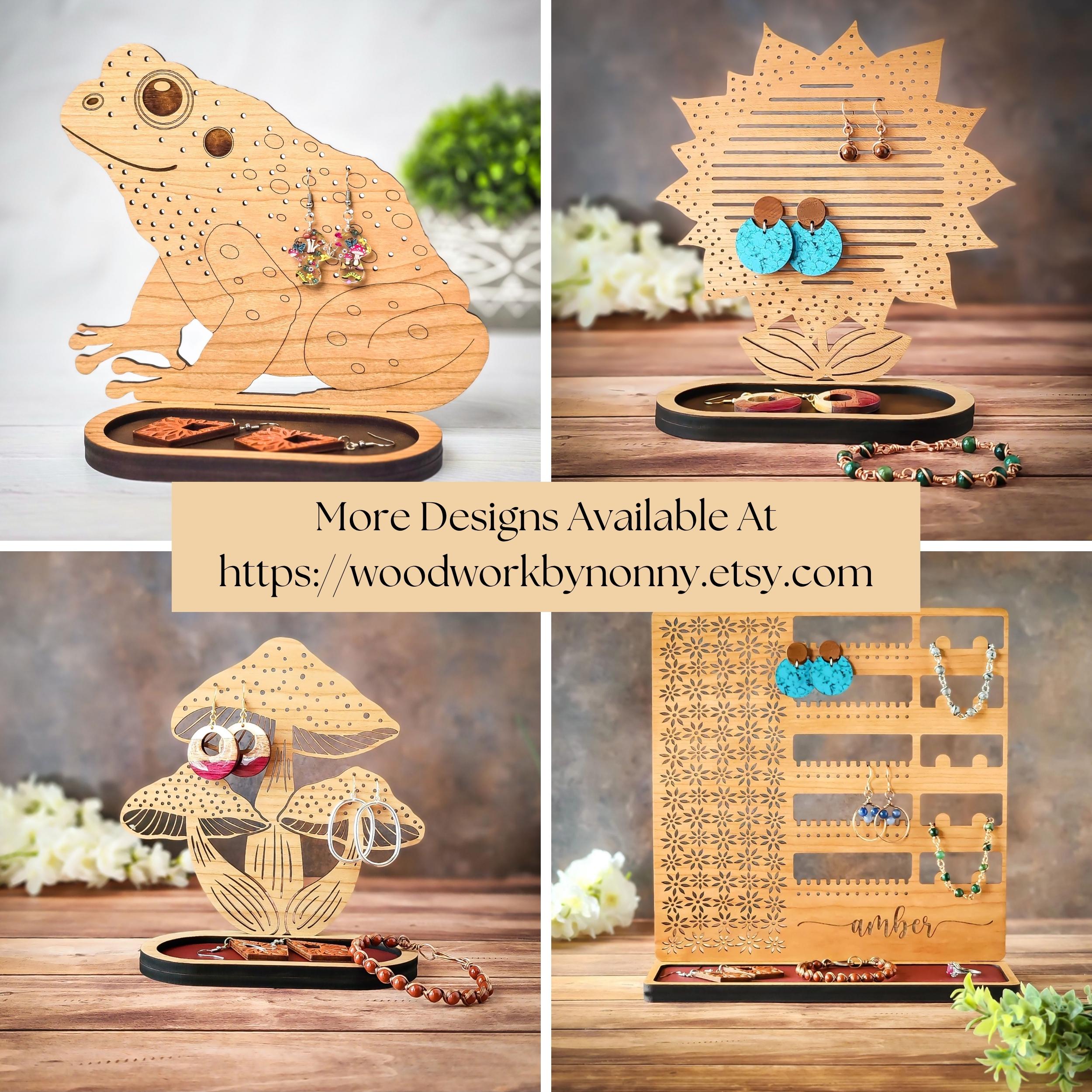 This personalized earring holder features a ring tray with your choice of vegan leatherette color, your desired engraved name and space for your earrings, bracelets and necklaces. The sun and moon design doubles as more earring storage in this large jewelry organizer. If you are looking for a unique birthday gift for your daughter, mom or even just yourself this piece would be perfect!